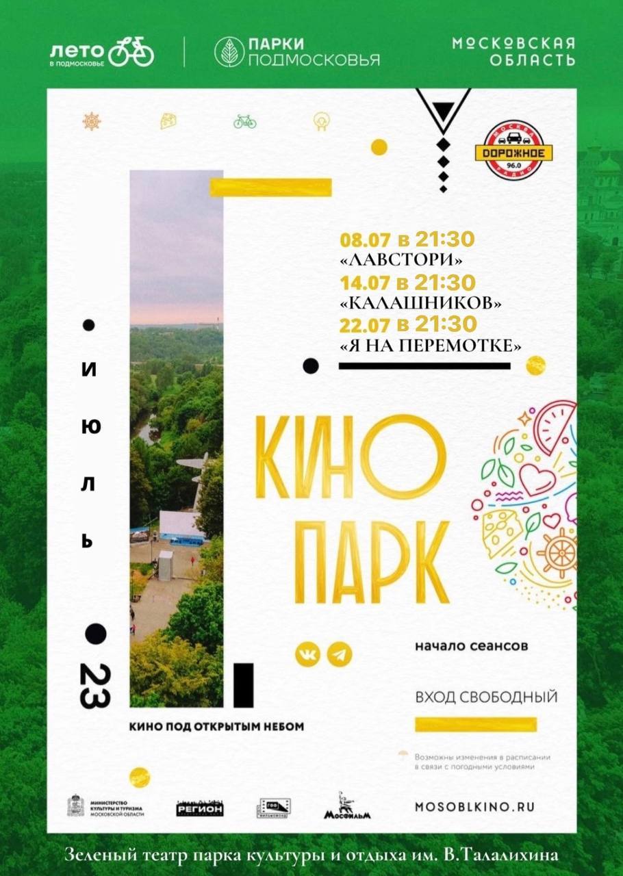 Первый в этом месяце кинопоказ (фильм «Лавстори») состоится в субботу, 8 июля, в зелёном театре парка.⠀⠀ Начало в 21:30;⠀⠀ Вход свободный. Мероприятие пройдёт в рамках проекта губернатора Московской области Андрея Воробьева «Лето в Подмосковье». Отметим, что показ состоится при благоприятных погодных условиях! С расписание других киносеансов можно ознакомиться на картинке. Источник и фото: «Официальный Подольск»