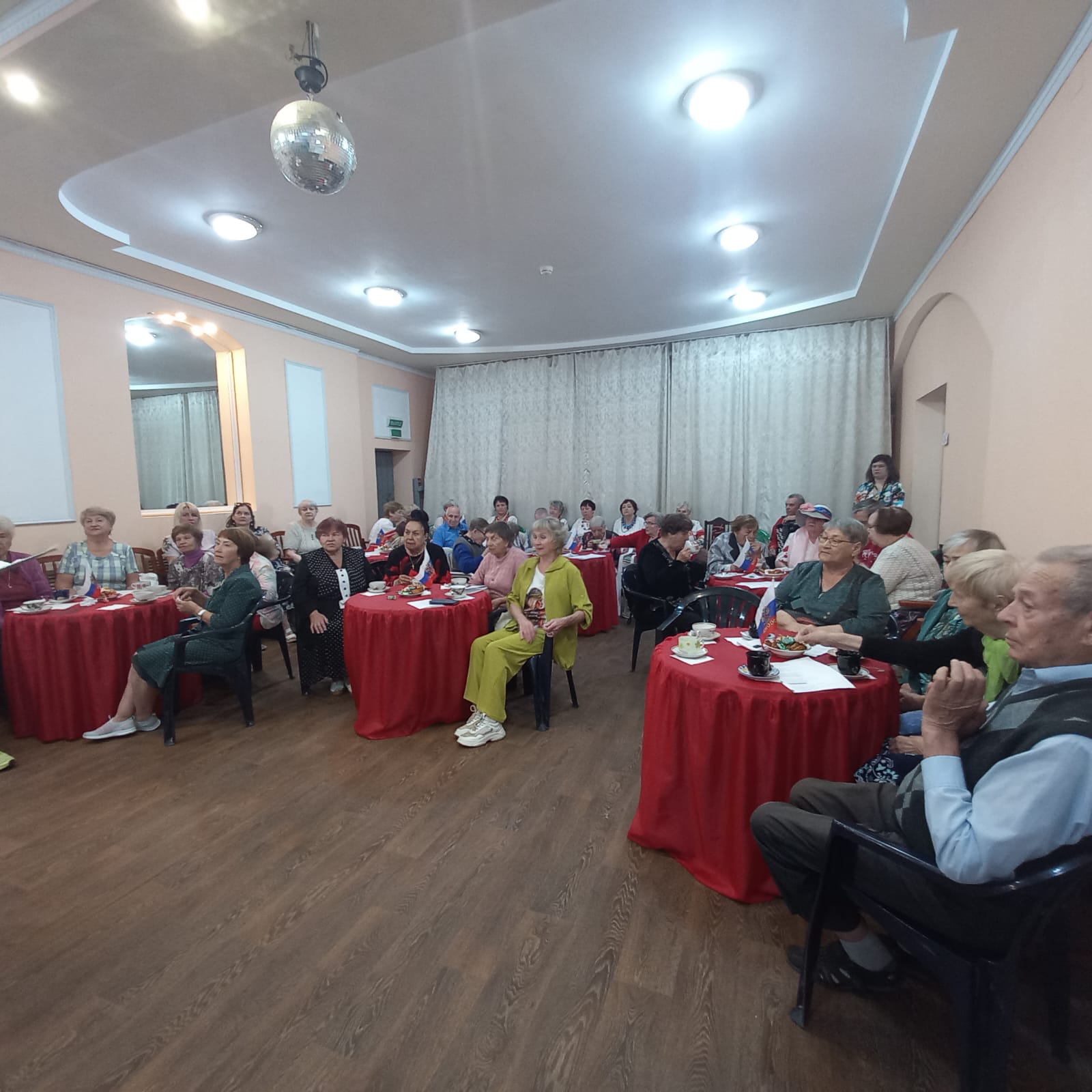 За чашкой чая участники, члены Общественной палаты, коллективы Дома культуры, члены районной общественной организации "Женсовет" и постояльцы Дмитровского соц.учреждения "Дом Доброты", пели песни о Родине, читали стихи о героях ВОВ, а также о героях СВО.