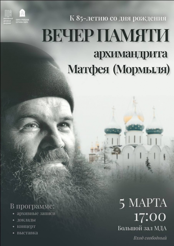 5 марта в 17:00 в Большом зале Московской духовной академии пройдет вечер, посвященный 85-летию со дня рождения заслуженного профессора МДА, регента Объединенного хора Свято-Троицкой Сергиевой лавры и Московской духовной академии и семинарии архимандрита Матфея (Мормыля).