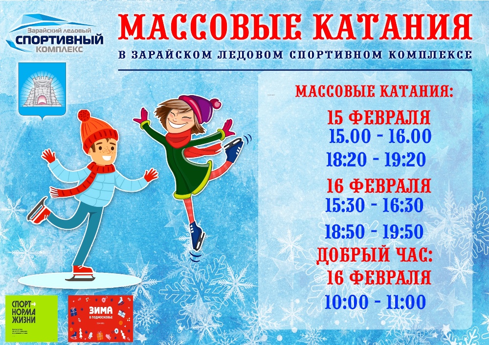 Афиша сеансов массовых катаний в Зарайском ледовом спортивном комплексе на эти выходные (15-16 февраля)!