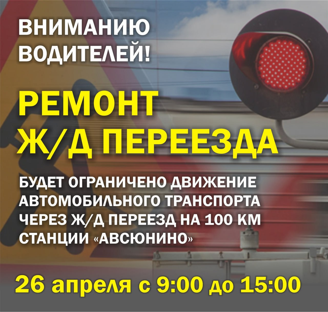 Вниманию водителей! 26 апреля с 9:00 до 15:00 будет ограничено движение автомобилей через железнодорожный переезд на 100 км станции «Авсюнино».