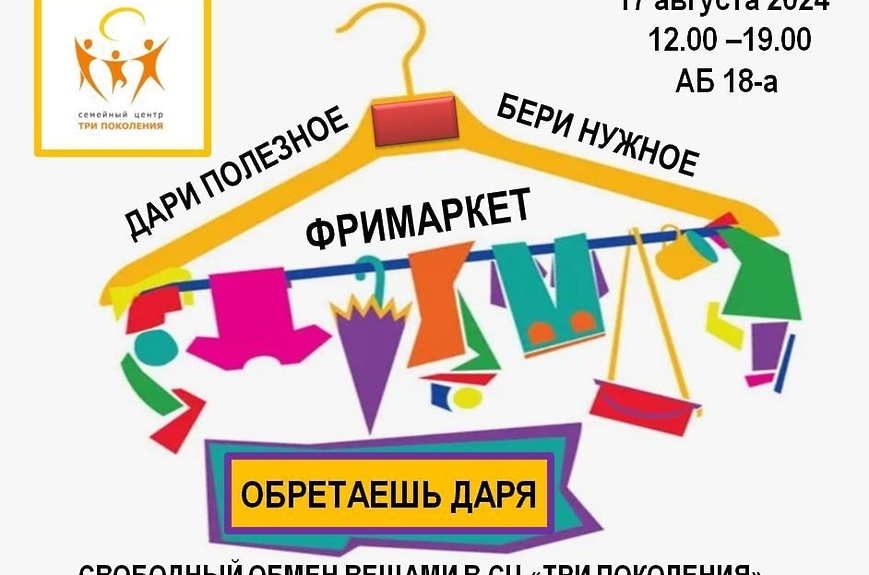 Фримаркет состоится в Семейном центре «Три поколения» в субботу 17 августа. Фримаркет – это бесплатная ярмарка, где люди могут отдать вещи, которые больше не нужны. Это отличная возможность для тех, кто хочет избавиться от ненужного и помочь другим.