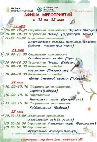 Предлагаем вашему вниманию расписание активностей и мероприятий в Кузьминском лесопарке с 22 по 28 мая!