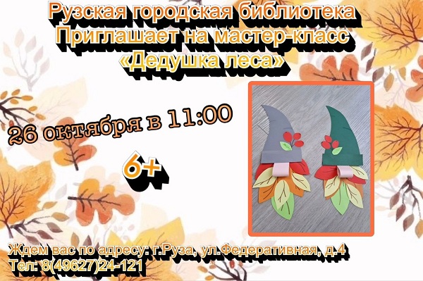 26 октября в студии нетрадиционной техники рисования «Цветные ступеньки» Рузской городской библиотеки пройдет мастер-класс под названием «Дедушка леса». Начало мероприятия запланировано на 11 часов утра.