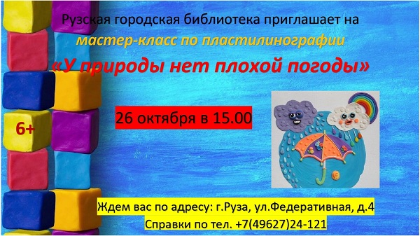 26 октября в 15 часов в арт-лаборатории «Пластилиновые фантазии» Рузской городской библиотеки пройдет мастер-класс «У природы нет плохой погоды». Это мероприятие станет отличной возможностью для всех желающих погрузиться в мир творчества и научиться создавать удивительные фигурки из пластилина.