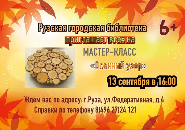 Рузская городская библиотека приглашает детей от 6 лет в творческую мастерскую «Чудо-ручки» на мастер-класс «Осенний узор». Он состоится 13 сентября в 16 часов.