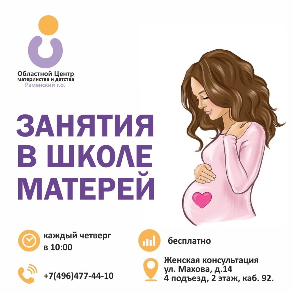 Очные занятия проходят 1 раз в неделю по четвергам в 10:00, в женской консультации (4 подъезд), в кабинете 92.