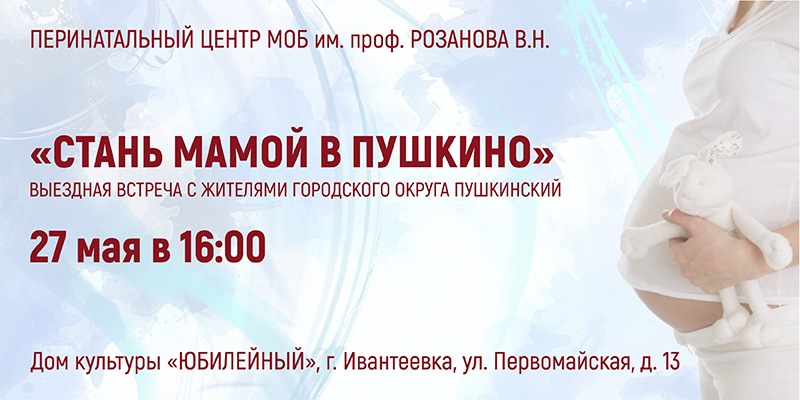 27 мая в 16:00 в ДК «Юбилейный», г. Ивантеевка (г. Ивантеевка, Первомайская улица, д. 13), в рамках проекта «Стань мамой в Пушкино» состоится выездная встреча с жителями городского округа Пушкинский.